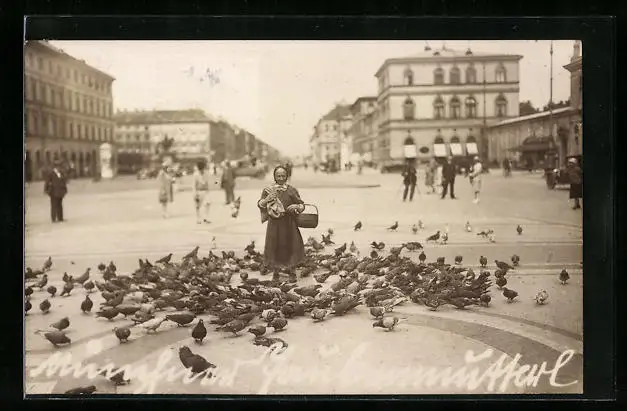 AK München, Taubenmutterl 80 Jahre alt füttert die Tauben