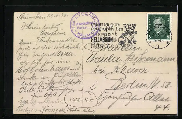Personenbezogene Daten auf der Rückseite der Karte wurden durch blauen Textmarker unkenntlich gemacht. Die blauen Stellen sind auf die Vorderseite durchgeweicht und wirken sich negativ auf das Postkartenfoto aus