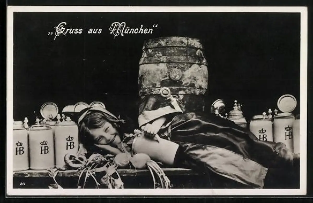 AK Münchner Kindl liegt lächelnd auf einem Tisch