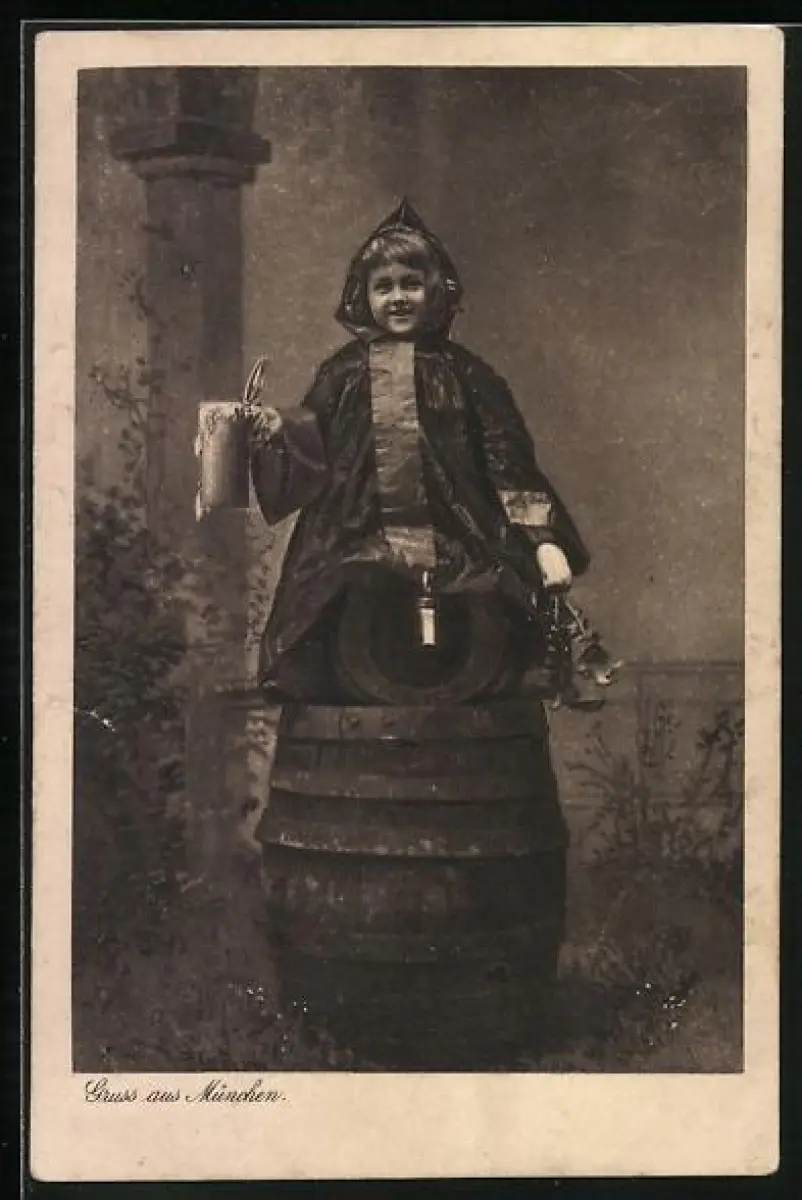 AK Münchner Kindl mit Bierkrug auf einem Fass