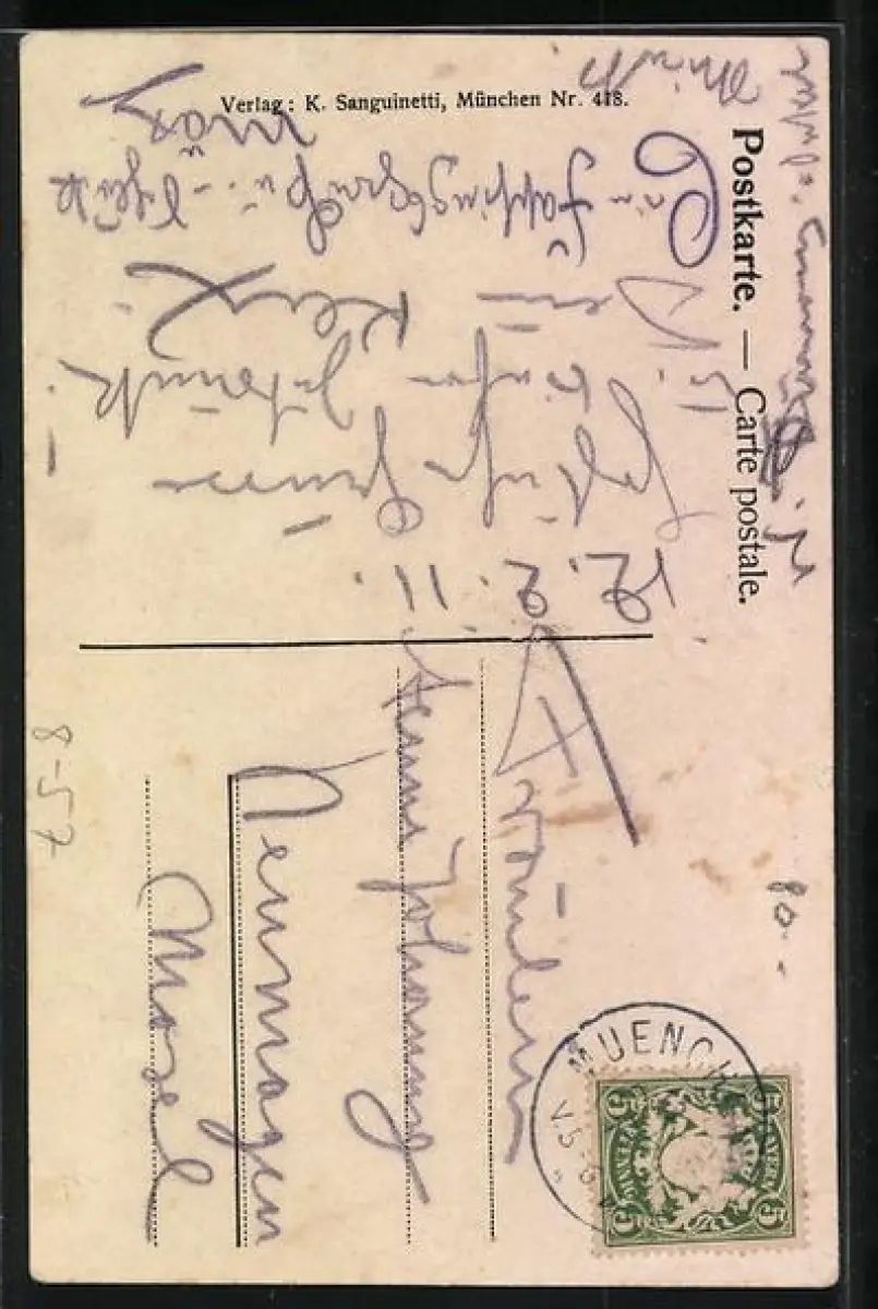 Personenbezogene Daten auf der Rückseite der Karte wurden durch blauen Textmarker unkenntlich gemacht. Die blauen Stellen sind auf die Vorderseite durchgeweicht und wirken sich negativ auf das Postkartenfoto aus