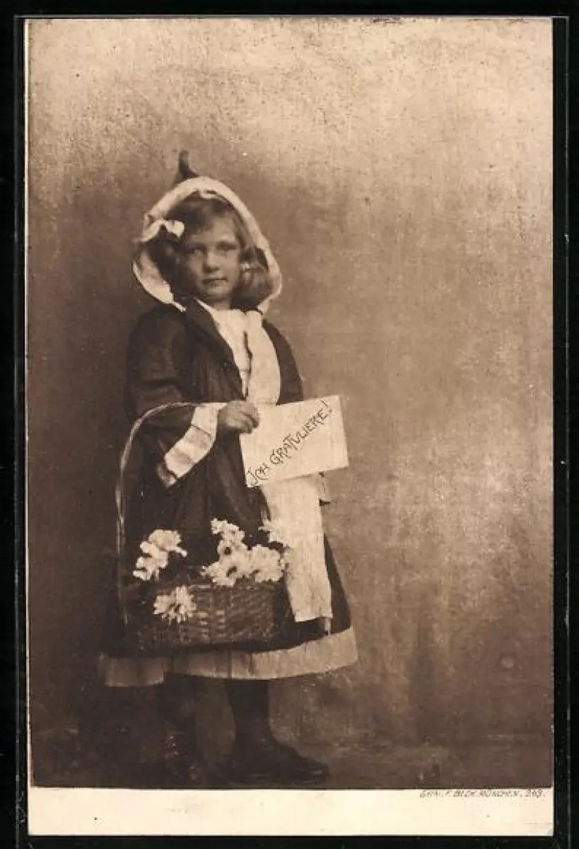 AK Münchner Kindl mit Blumenkorb