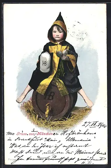 AK Münchner Kindl mit Rettich auf dem Bierfass