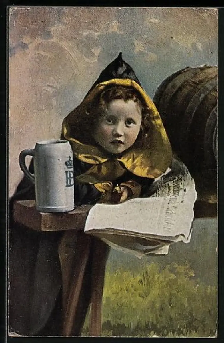 AK Münchner Kindl mit Zeitung und Bierseidel