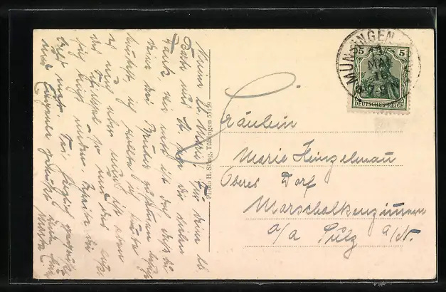 Personenbezogene Daten auf der Rückseite der Karte wurden durch blauen Textmarker unkenntlich gemacht. Die blauen Stellen sind auf die Vorderseite durchgeweicht und wirken sich negativ auf das Postkartenfoto aus