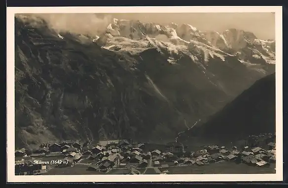 AK Mürren, Ortsansicht mit Gipfelpanorama aus der Vogelschau