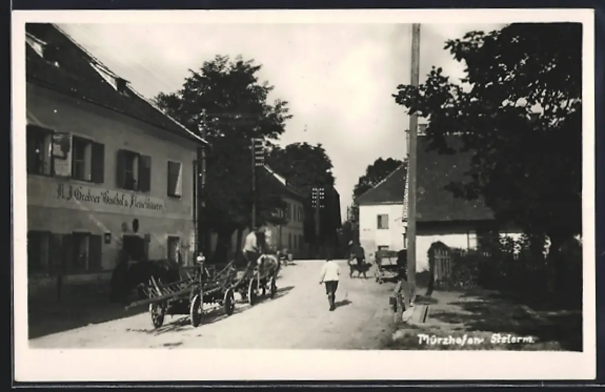 AK Mürzhofen, Strassenpartie mit Grabners Gasthof und Fleischhauerei