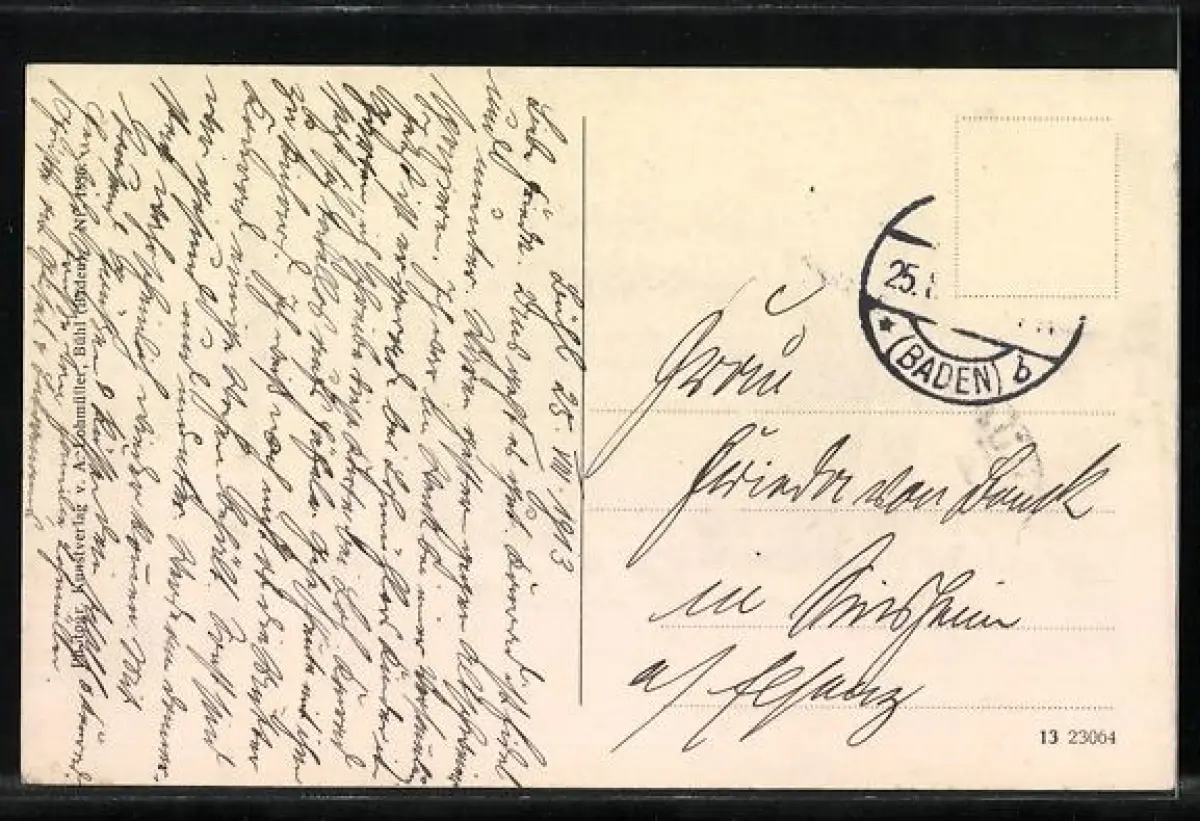 Personenbezogene Daten auf der Rückseite der Karte wurden durch blauen Textmarker unkenntlich gemacht. Die blauen Stellen sind auf die Vorderseite durchgeweicht und wirken sich negativ auf das Postkartenfoto aus