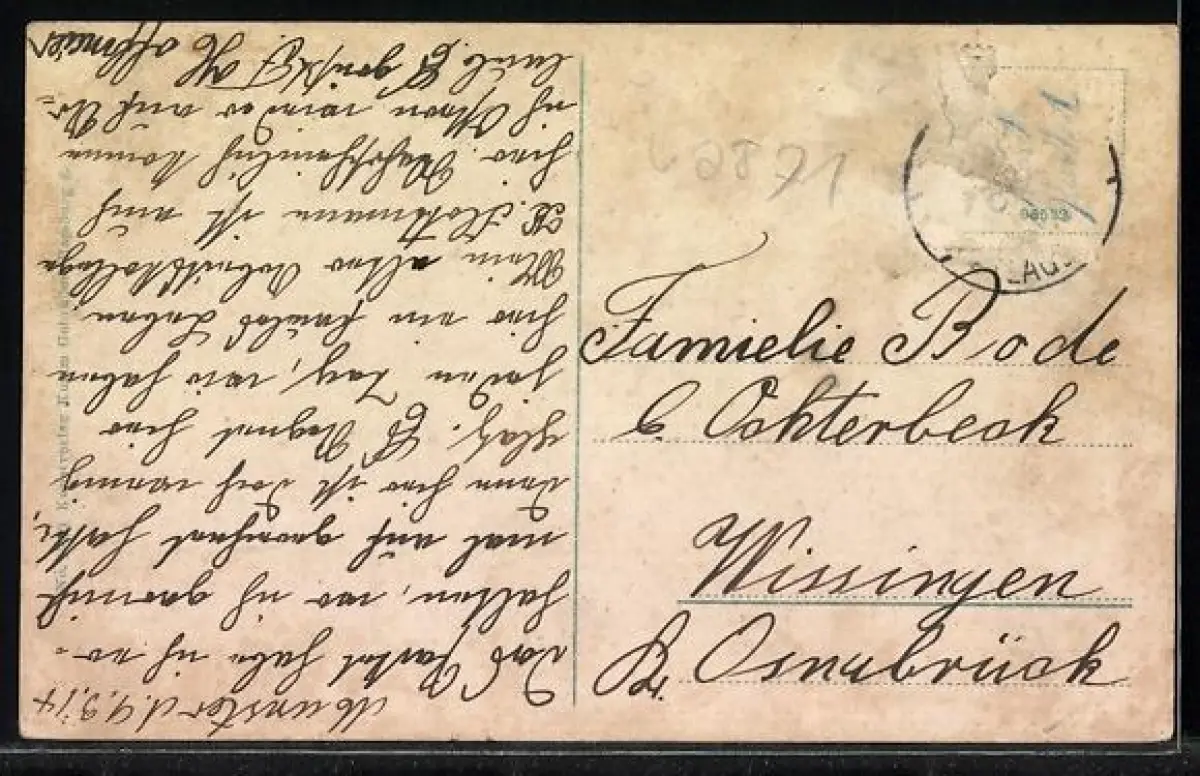 Personenbezogene Daten auf der Rückseite der Karte wurden durch blauen Textmarker unkenntlich gemacht. Die blauen Stellen sind auf die Vorderseite durchgeweicht und wirken sich negativ auf das Postkartenfoto aus