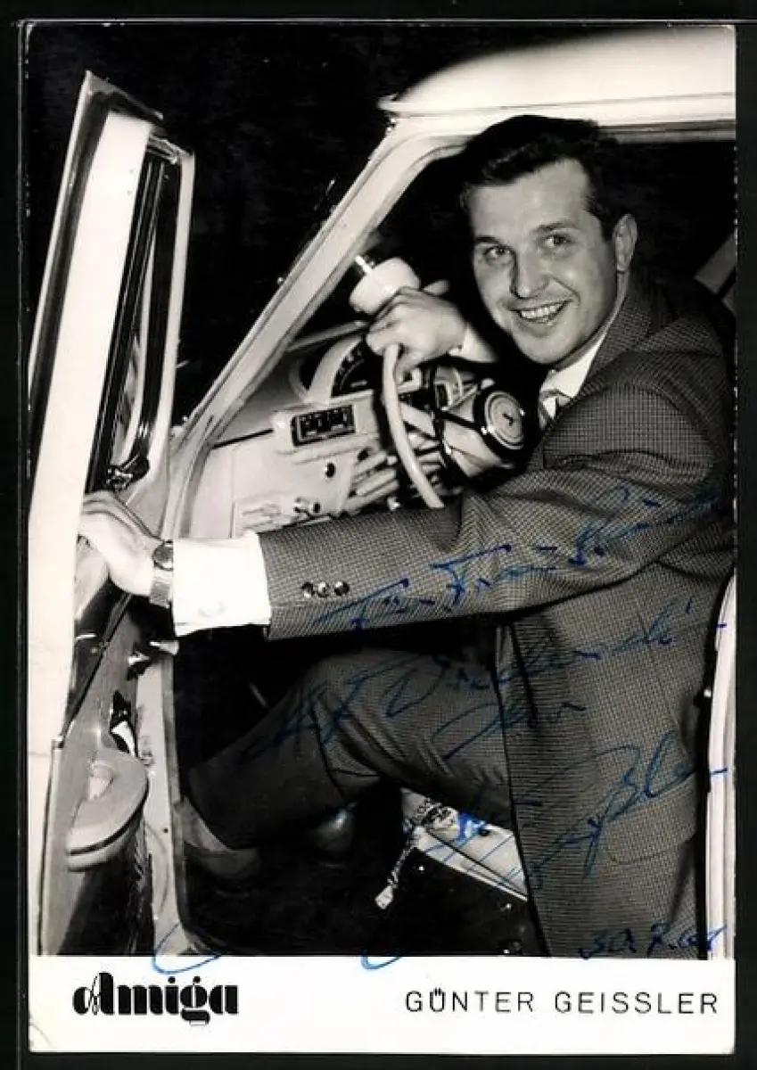 AK Musiker Günter Geissler aus einem Auto steigend, Autograph
