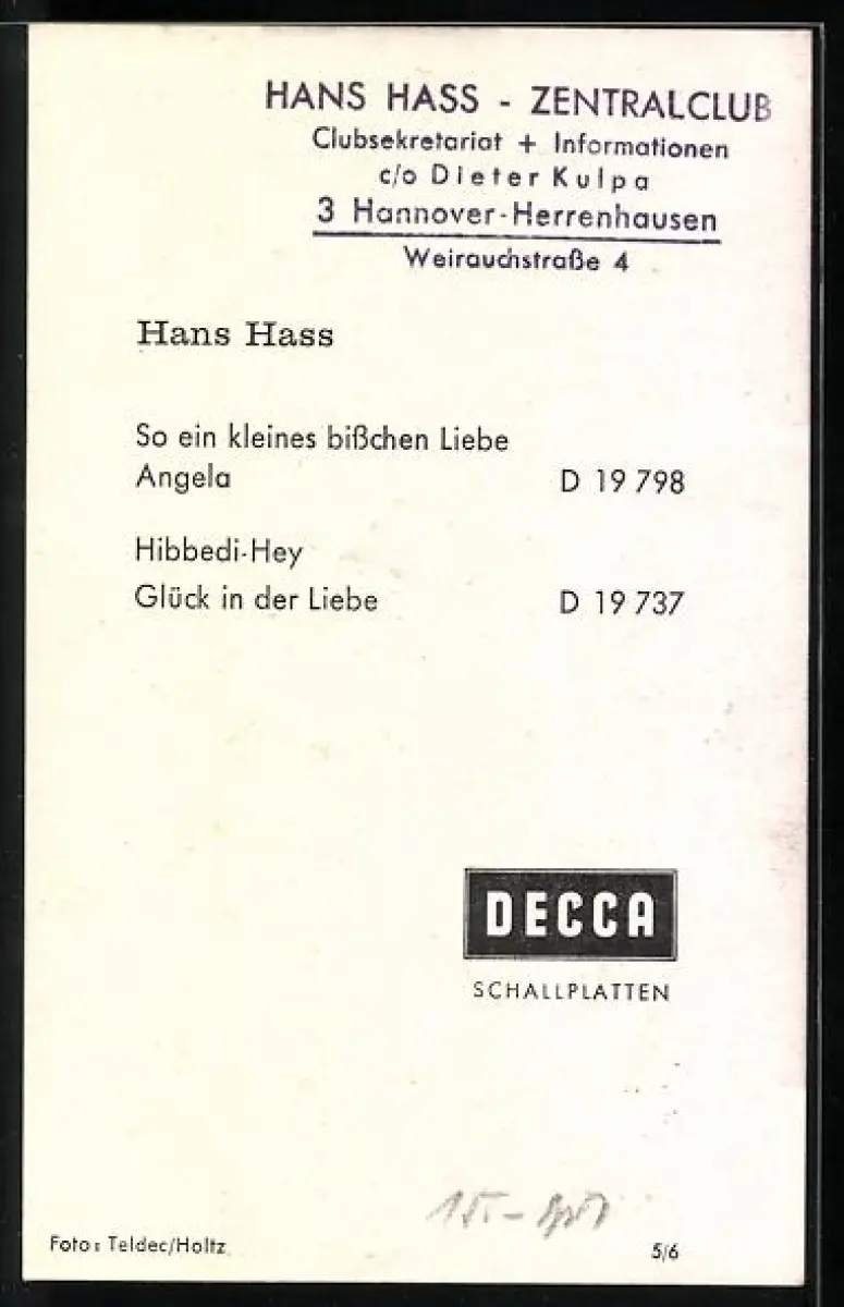 AK Musiker Hans Hass, En-face Portrait, Decca Schallplatten, Autograph