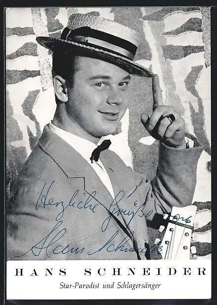 AK Musiker Hans Schneider mit Gitarre und Strohhut, Autograph