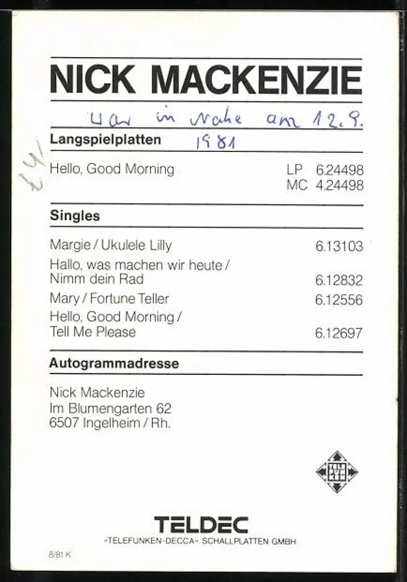 AK Musiker Nick Mackenzie mit Zeitung am Frühstückstisch, Autograph