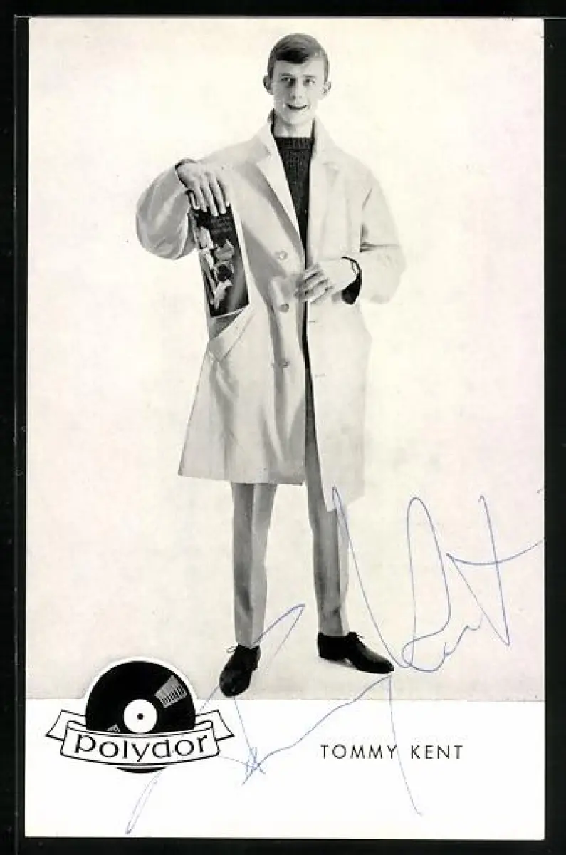 AK Musiker Tommy Kent, Ganzportrait im Mantel mit Zeitschrift, Autograph