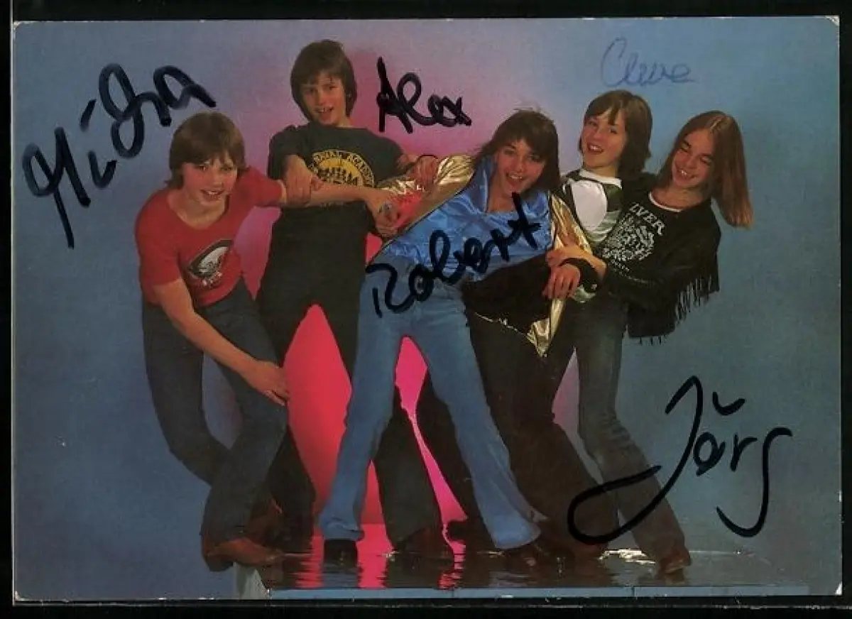 AK Musiker der Band Teens in bunter Kleidung, Autogramme