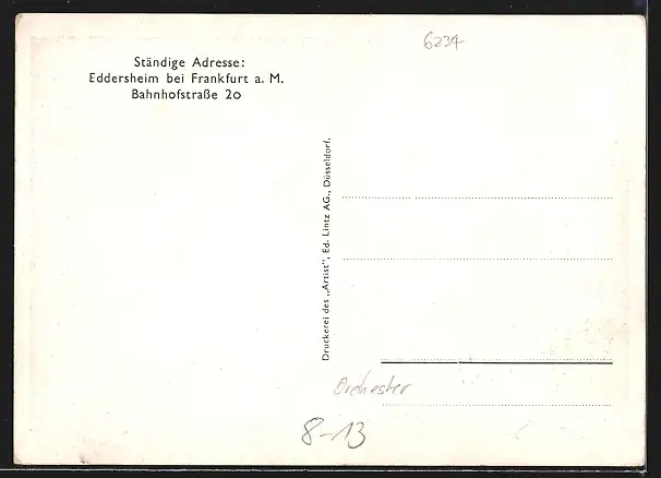 Personenbezogene Daten auf der Rückseite der Karte wurden durch blauen Textmarker unkenntlich gemacht. Die blauen Stellen sind auf die Vorderseite durchgeweicht und wirken sich negativ auf das Postkartenfoto aus