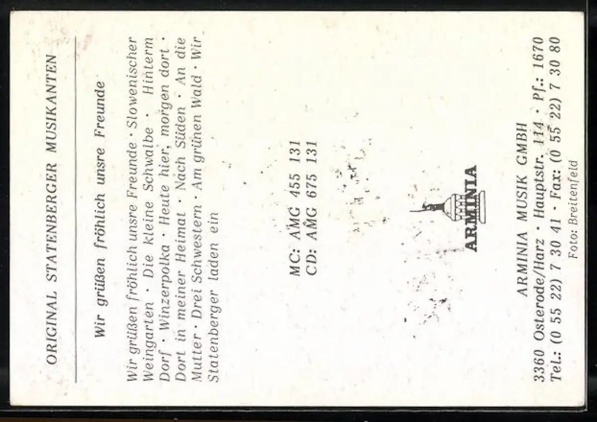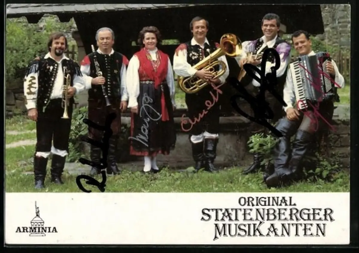 AK Musikergruppe Statenberger Musikanten mit Instrumenten im Portrait, Autographen