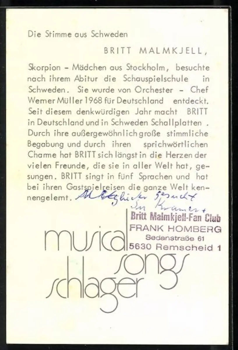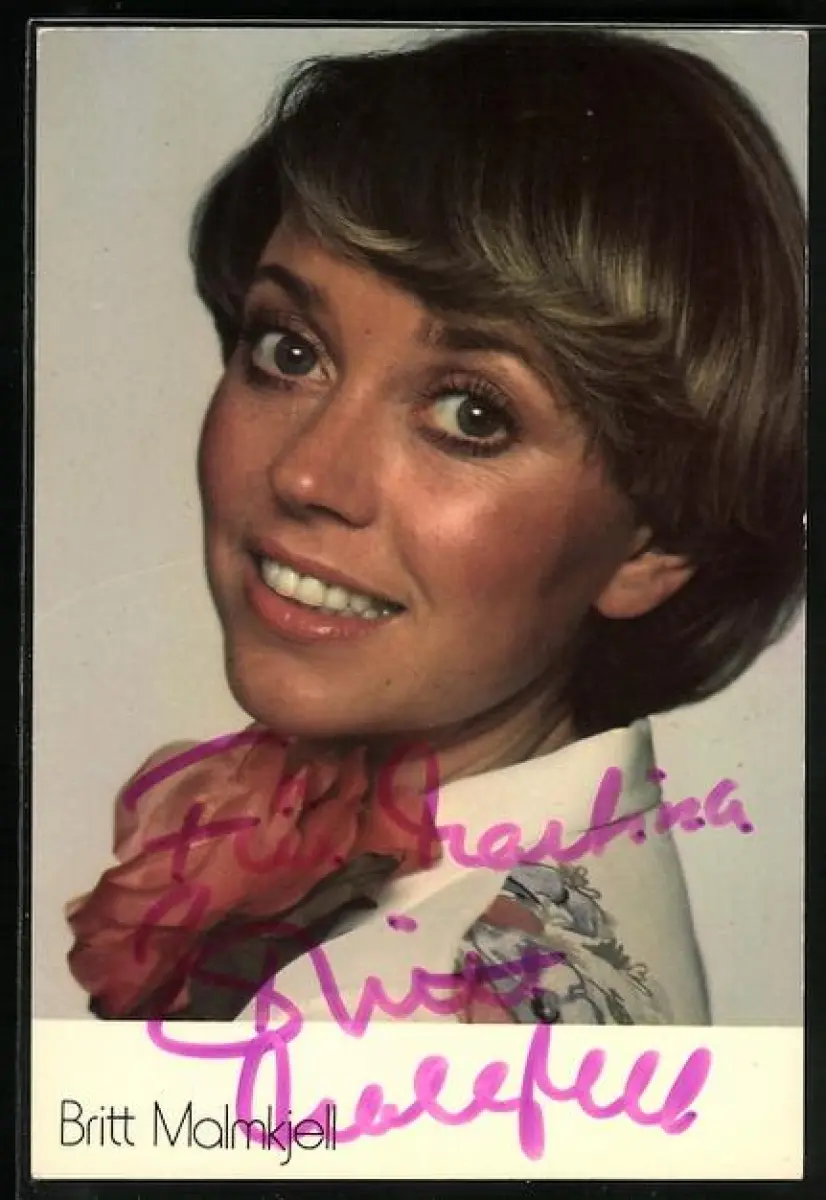 AK Musikerin Britt Malmkjell in die Kamera blickend, Autograph