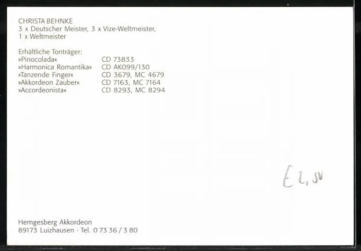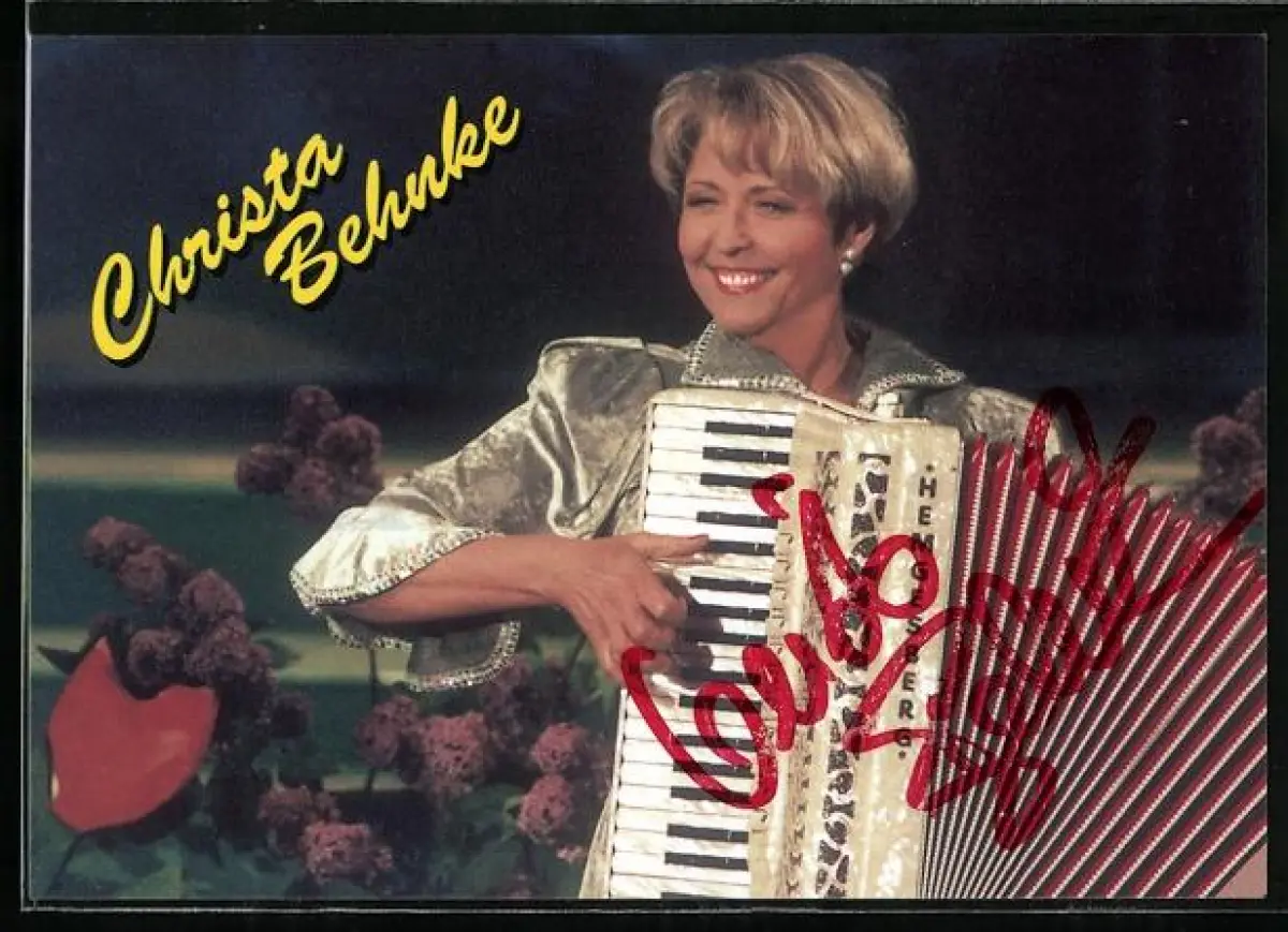 AK Musikerin Christa Behnke mit Akkordeon, Autograph