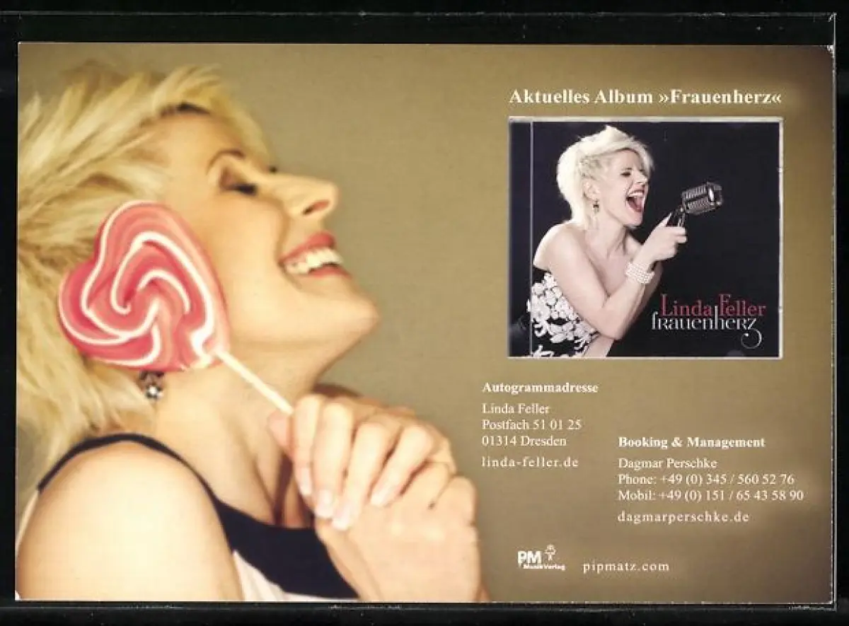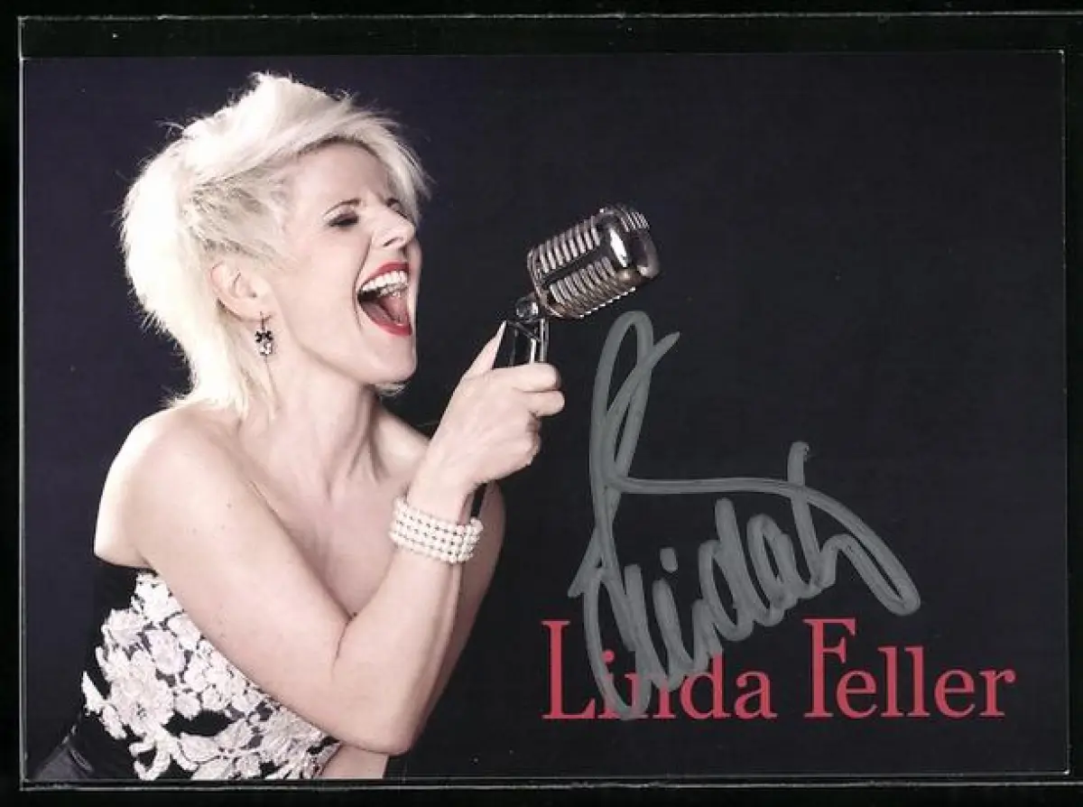 AK Musikerin Linda Feller singend im Porträt, Autograph