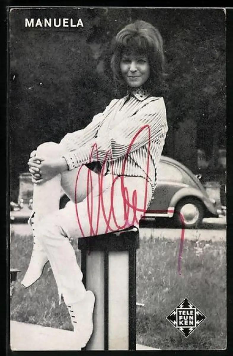 AK Musikerin Manuela auf einer Säule sitzend, Autograph