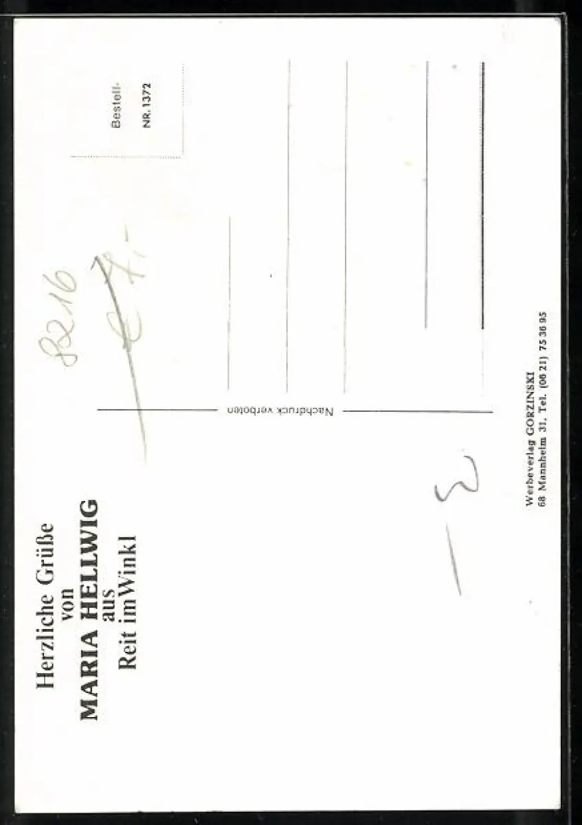 Personenbezogene Daten auf der Rückseite der Karte wurden durch blauen Textmarker unkenntlich gemacht. Die blauen Stellen sind auf die Vorderseite durchgeweicht und wirken sich negativ auf das Postkartenfoto aus