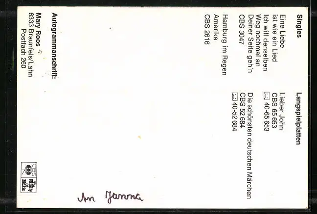 AK Musikerin Mary Roos schaut über ihre Schulter, Autograph