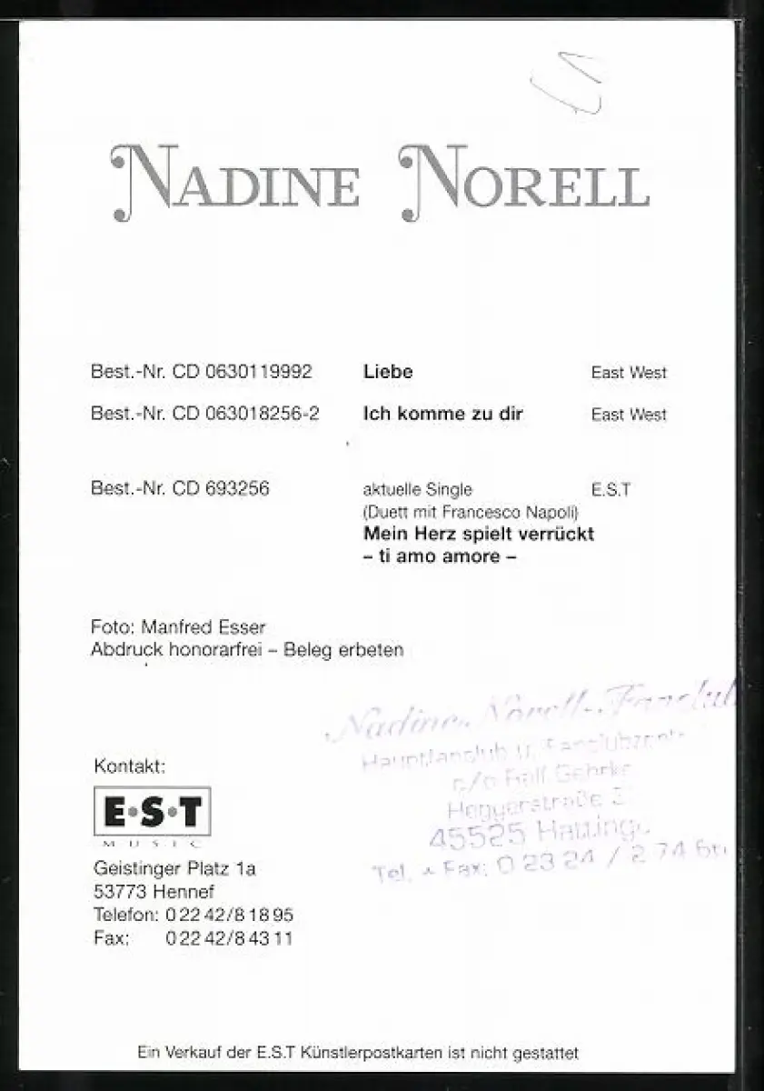 AK Musikerin Nadine Norell vor rosanem Hintergrund, Autograph