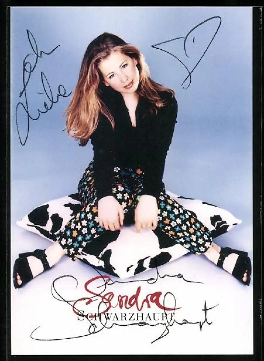 AK Musikerin Sandra Schwarzhaupt auf einem Kissen sitzend, Autograph