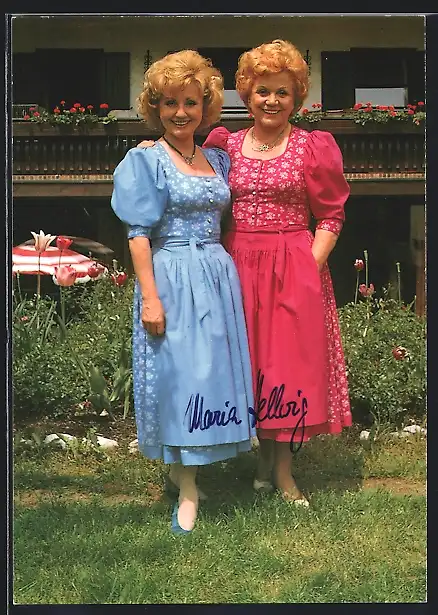 AK Musikerinnen Maria und Margot Hellwig in farbenfrohen Kleidern vor einem Haus, mit Autograph