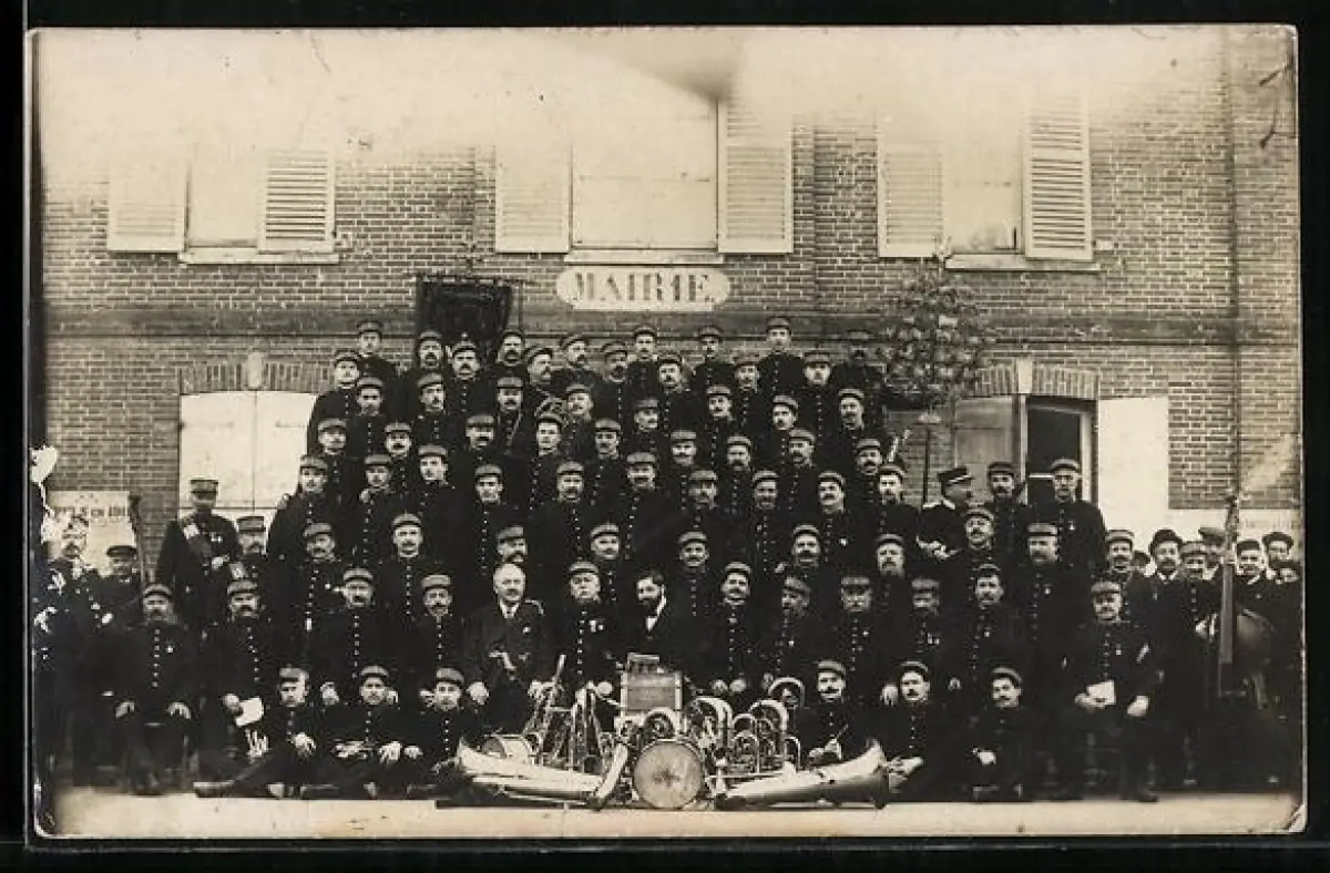 AK Musikkapelle mit Blasinstrumenten vor dem Rathaus