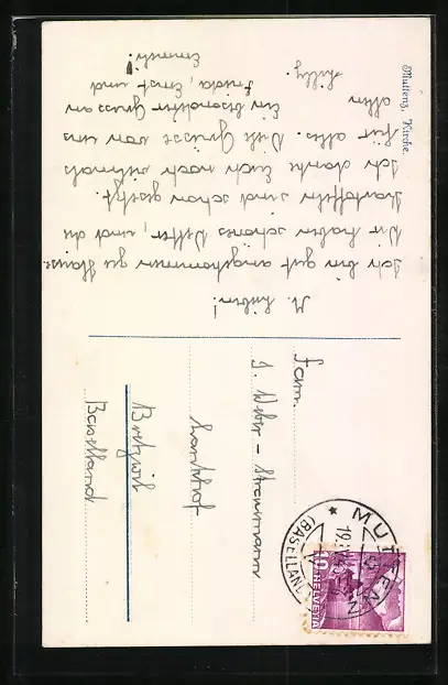 Personenbezogene Daten auf der Rückseite der Karte wurden durch blauen Textmarker unkenntlich gemacht. Die blauen Stellen sind auf die Vorderseite durchgeweicht und wirken sich negativ auf das Postkartenfoto aus