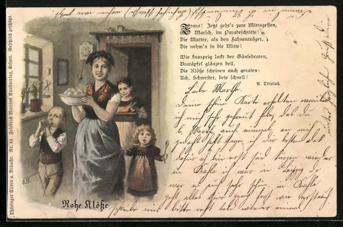 AK Mutter präsentiert das Mittagessen mit Brathähnchen und Rohen Klössen