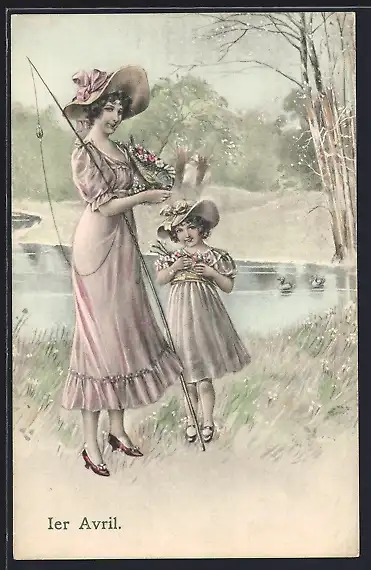 AK Mutter und Tochter mit Angel und Fisch, 1. April