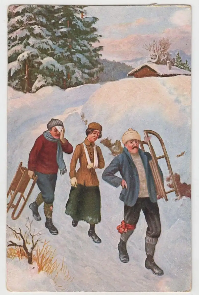 AK Nach der Schlittenfahrt, Humorvolle illustrierte Postkarte um 1900