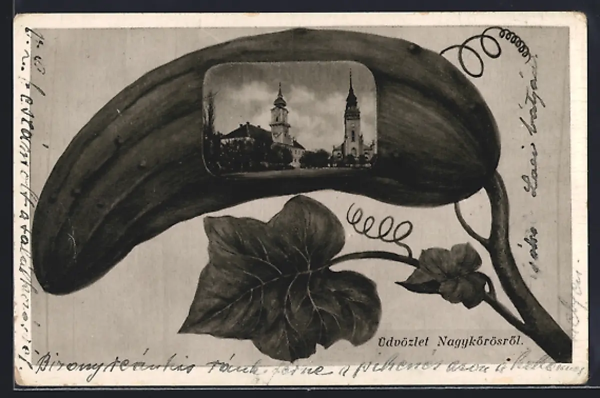 AK Nagykörös, Ortspartie mit Kirche im Passepartout auf einer Gurke