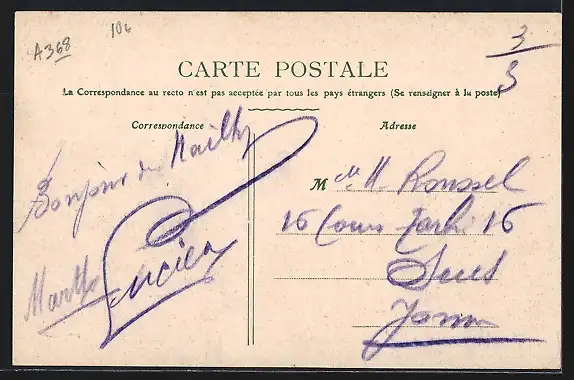 Personenbezogene Daten auf der Rückseite der Karte wurden durch blauen Textmarker unkenntlich gemacht. Die blauen Stellen sind auf die Vorderseite durchgeweicht und wirken sich negativ auf das Postkartenfoto aus