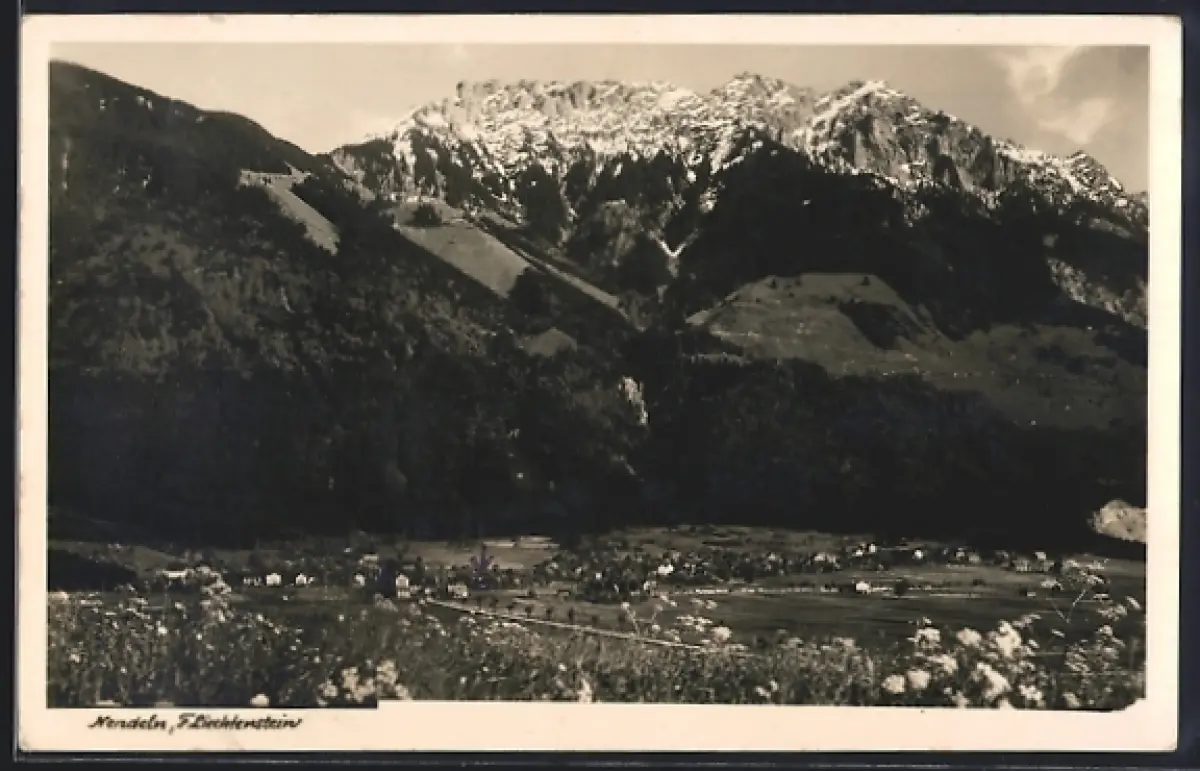AK Nendeln, Ortsansicht mit Bergpanorama