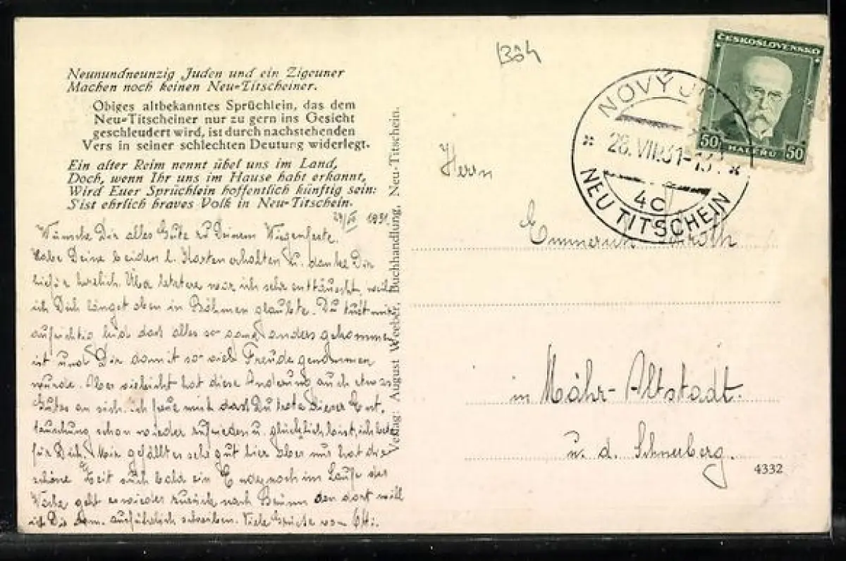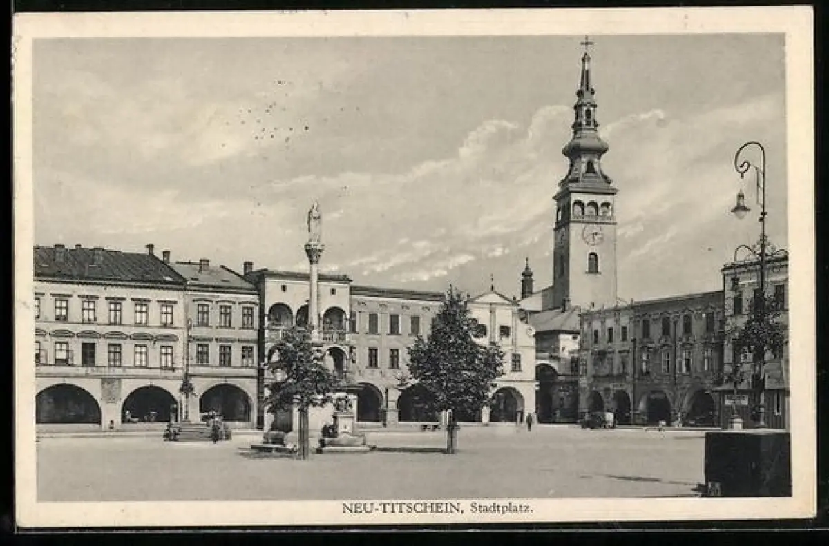 AK Neu-Titschein, Stadtplatz mit Denkmal