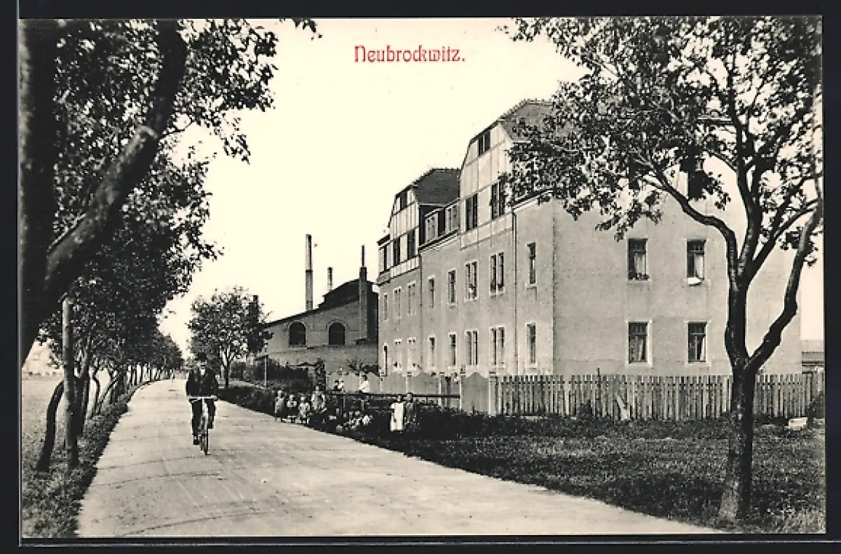 AK Neubrockwitz, Strassenpartie mit Fabrik und Radfahrer
