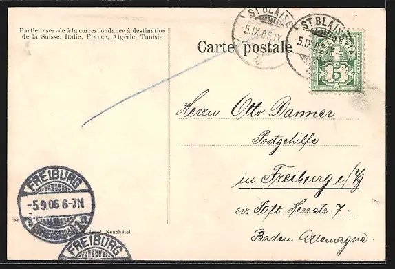 Personenbezogene Daten auf der Rückseite der Karte wurden durch blauen Textmarker unkenntlich gemacht. Die blauen Stellen sind auf die Vorderseite durchgeweicht und wirken sich negativ auf das Postkartenfoto aus