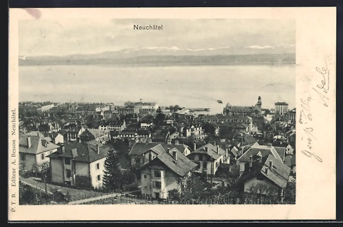 AK Neuchatel, Totalansicht mit Wasserblick u. Bergpanorama aus der Vogelschau