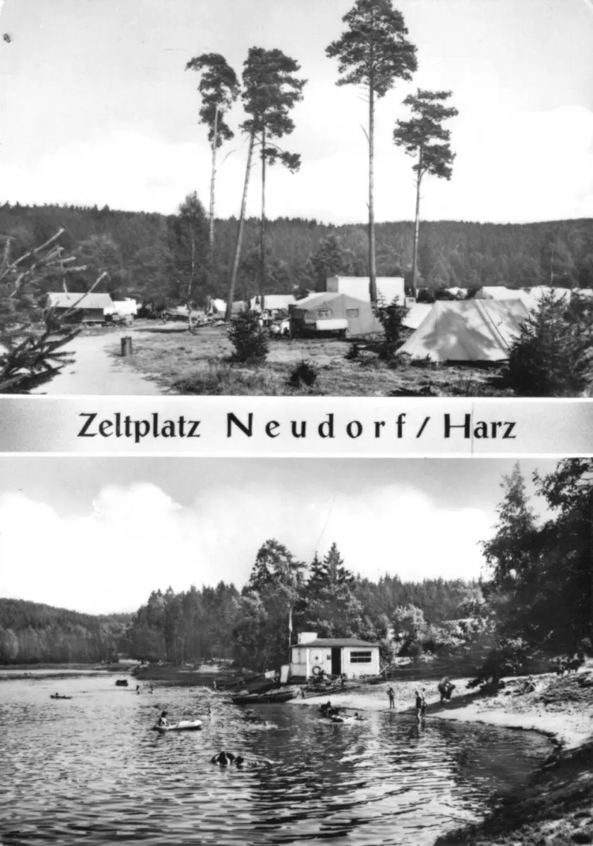 Ansichtskarte Neudorf Harz Zeltplatz, zwei Abb. Erhaltung I-II ungelaufen Druckvermerk: 1968 Herstellungsland: DDR Verlag: E. Riehn, 37 Wernigerode Harz - 931b/c