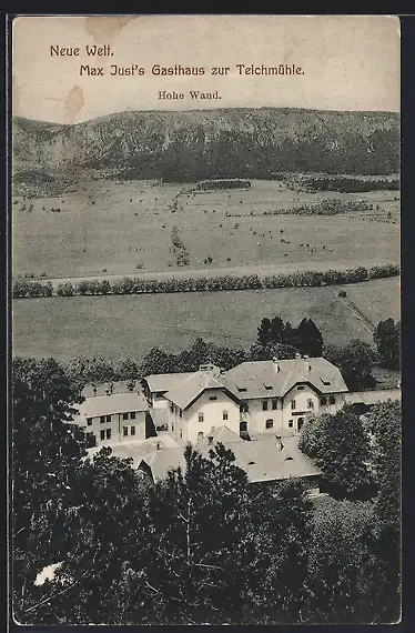 AK Neue Welt, Max Justs Gasthaus zur Teichmühle, im Hintergrund Hohe Wand