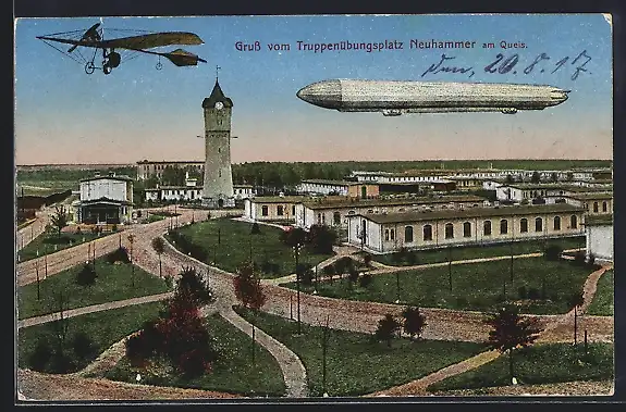 AK Neuhammer a. Queis, Truppenübungsplatz mit Zeppelin und Flugzeug