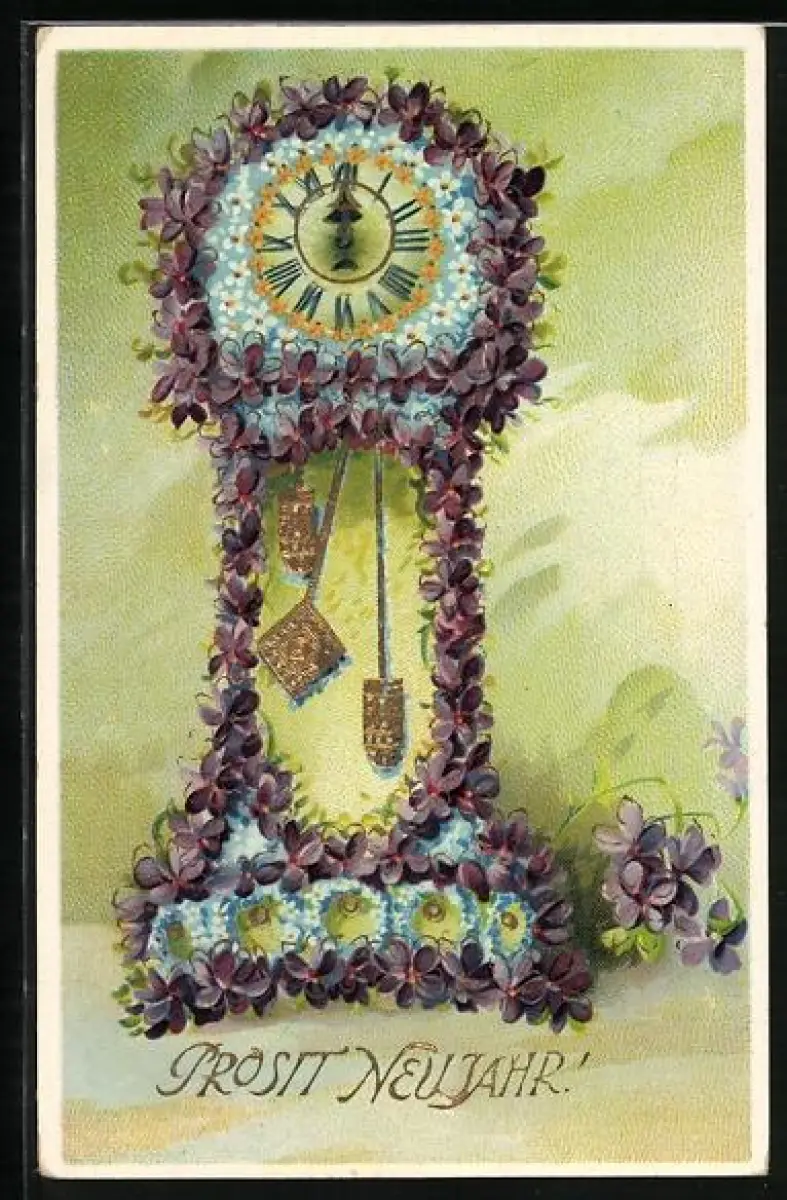 AK Neujahr, Blumenuhr zeigt 12 Uhr Nachts