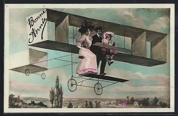 AK Neujahrsgrüsse, Kleine Familie in einem Segelflugzeug