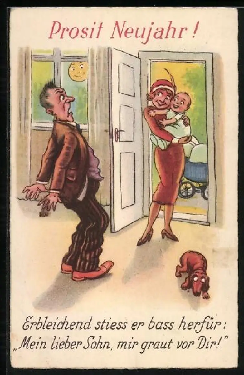 AK Neujahrsscherz, Mutter zeigt ihm erstmalig seinen Sohn, Mein lieber Sohn, mir graut vor Dir!