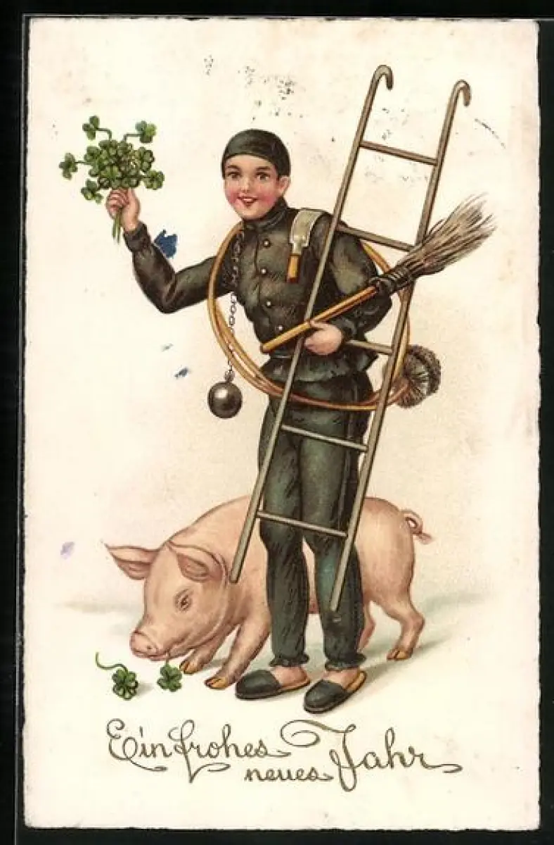 AK Neujahrswünsche, Schornsteinfeger und Glücksschwein und Klee