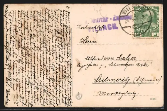 Personenbezogene Daten auf der Rückseite der Karte wurden durch blauen Textmarker unkenntlich gemacht. Die blauen Stellen sind auf die Vorderseite durchgeweicht und wirken sich negativ auf das Postkartenfoto aus